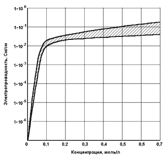 Следует пояснить, что термин “вода” в приложении к процессам электрохимической активации, обозначает разбавленный водный раствор электролитов простого или сложного состава с общей концентрацией от нескольких миллиграммов до нескольких граммов в одном литре. В общем случае, это и дистиллированная, и ультрапресная, и пресная, в том числе питьевая, и слабоминерализованная (техническая) вода, т.е. водные растворы электролитов, удельная электропроводность которых значительно изменяется при относительно небольшом изменении концентрации. На рис. 1 показана обобщенная зависимость удельной электропроводности большинства неорганических электролитов - кислот, оснований, солей от их концентрации. Эффекты электрохимической активации ярко проявляются для водных растворов, концентрация электролитов в которых меньше 0,1 моль/л и существенно ослабевают в растворах, концентрация электролитов в которых больше 0,1 моль/л.